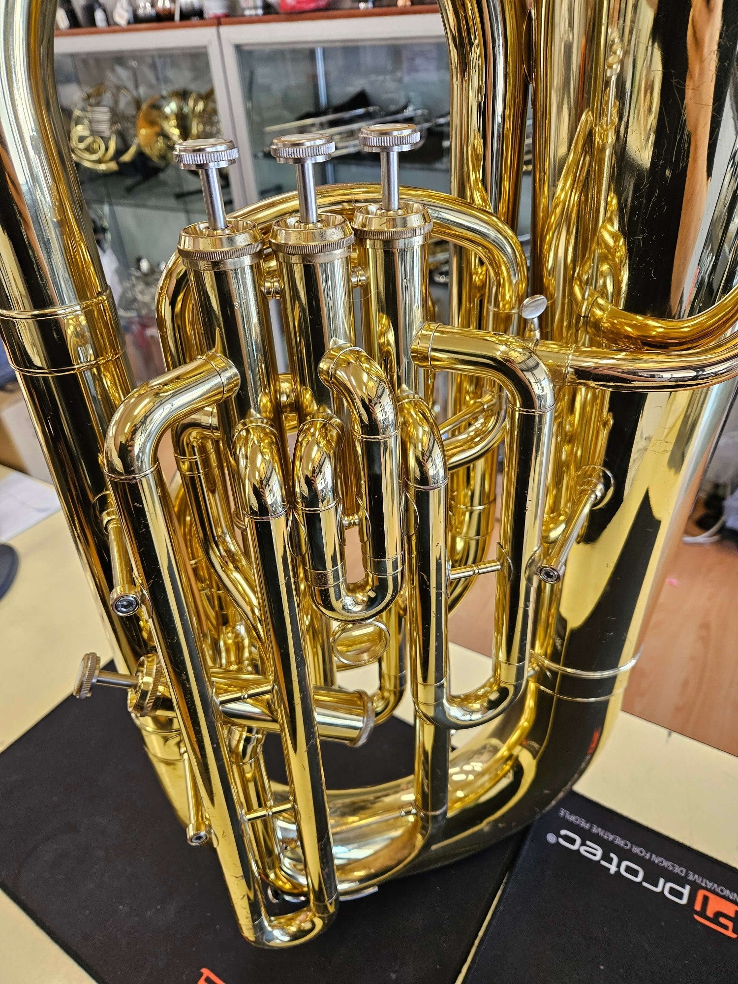 The JCB-376 features a traditional 3+1 valve design with 3 top action valves and an angled left hand 4th valve. It also features stainless steel pistons and rose brass mouthpipe. 15" bell, 0.689" bore while 4th valve in 0.748" bore.